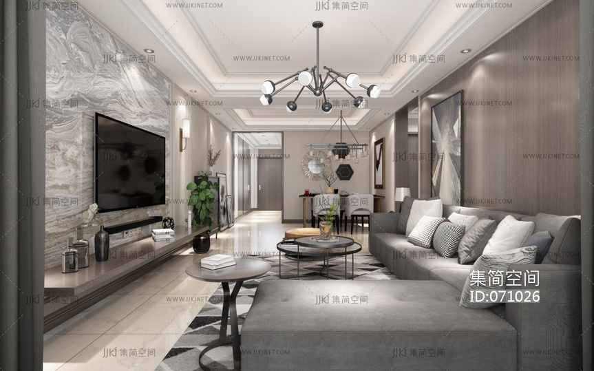 中古风客厅,美式客厅,圆形茶几,装饰画,移动电视,3d模型下载