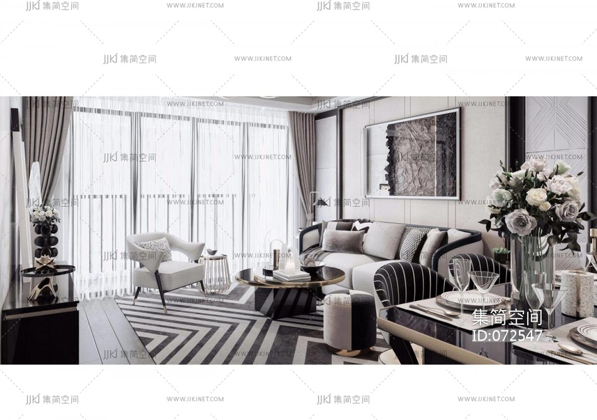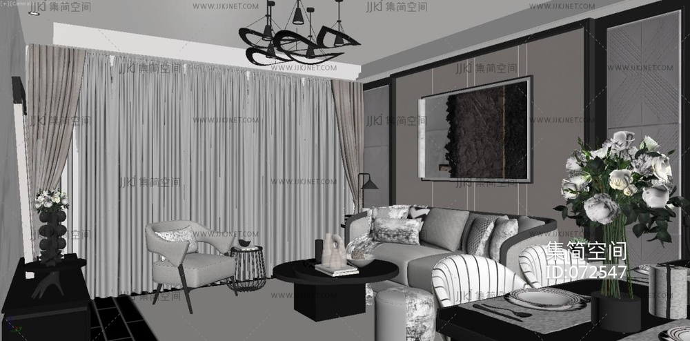 中古风客厅,美式客厅,圆形茶几,装饰画,移动电视,3d模型下载