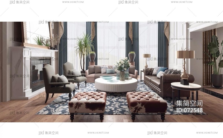 中古风客厅,美式客厅,圆形茶几,装饰画,移动电视,3d模型下载