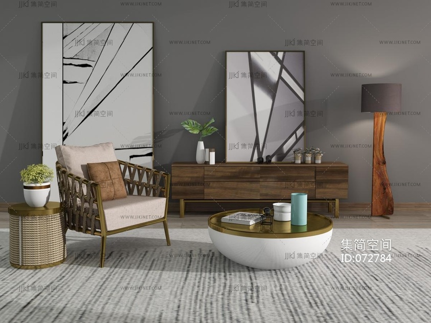 01-现代法式单人沙发_休闲椅_单椅_扶手椅圆形边几书本书籍玻璃水杯3D模型3d模型下载
