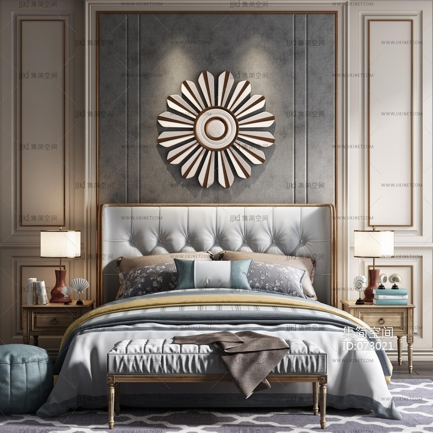 欧式双人床床头柜台灯组合3d模型下载