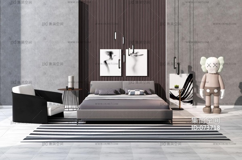 卧室,轻奢,暗黑风,现代轻奢卧室双人床,懒人沙发法式卧室3d模型下载