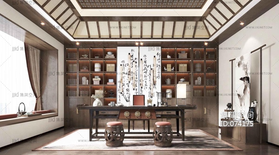 现代书房 书桌椅 壁柜 挂画 吊灯 书 盆栽 摆件3d模型下载