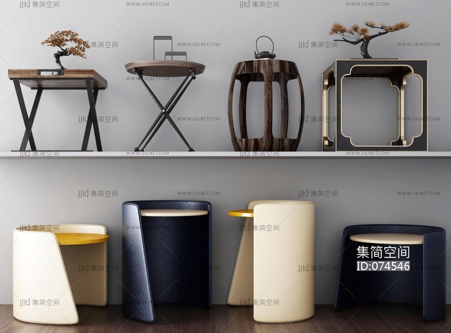 08中式现代边几鼓凳床头柜茶几 3d模型下载 [模型ID:74546]