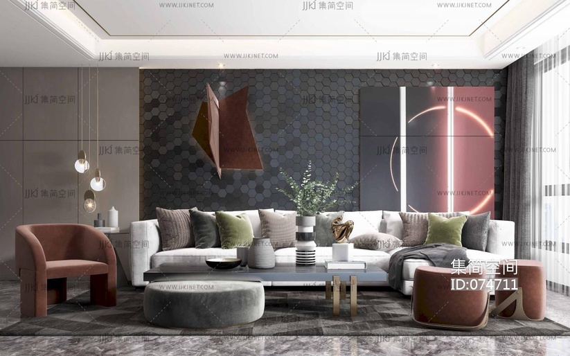 中古风客厅 沙发茶几组合 背景墙3d模型下载