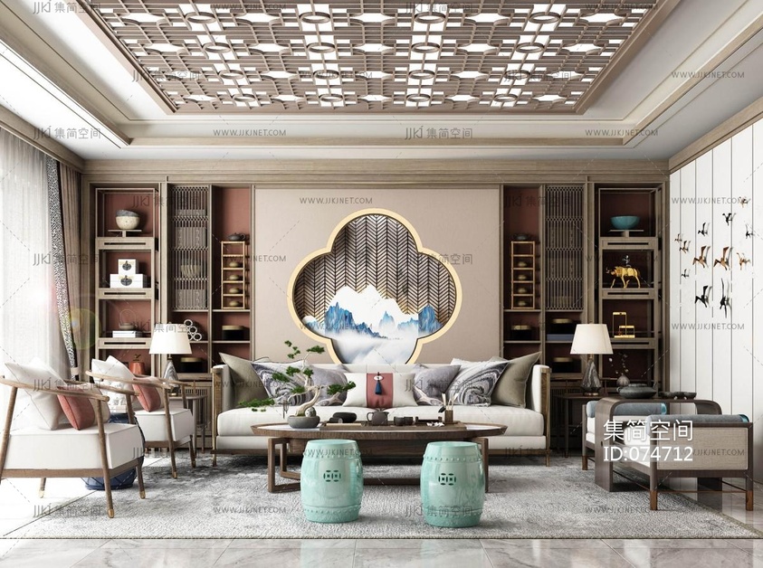 中古风客厅 沙发茶几组合 背景墙3d模型下载