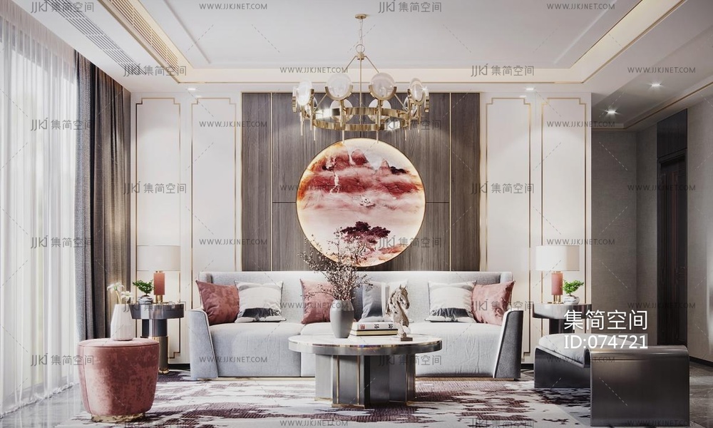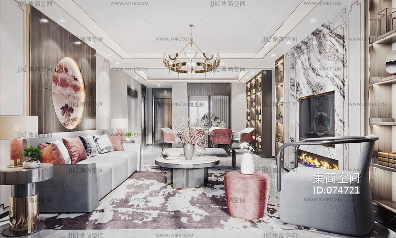 中古风客厅,美式客厅,圆形茶几,装饰画,移动电视,3d模型下载