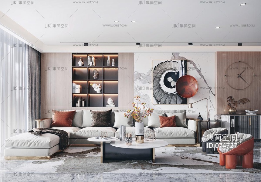 中古风客厅,美式客厅,圆形茶几,装饰画,移动电视,3d模型下载