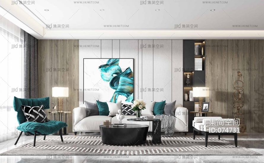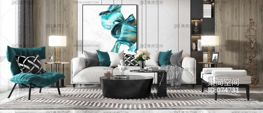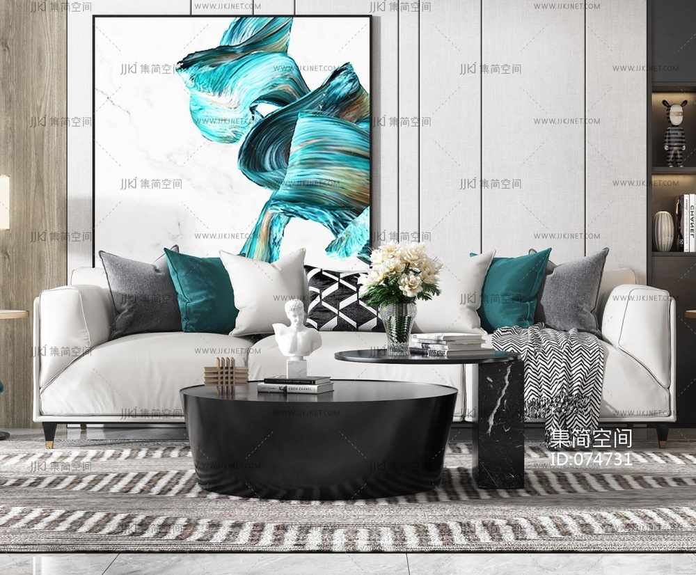 中古风客厅,美式客厅,圆形茶几,装饰画,移动电视,3d模型下载