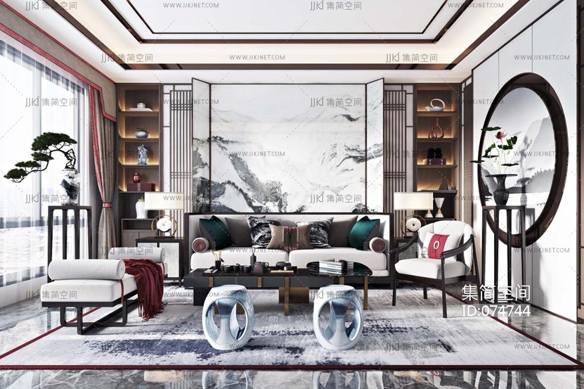 中古风客厅 沙发茶几组合 背景墙3d模型下载