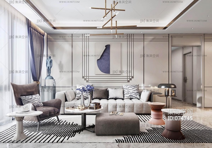 中古风客厅 沙发茶几组合 背景墙3d模型下载
