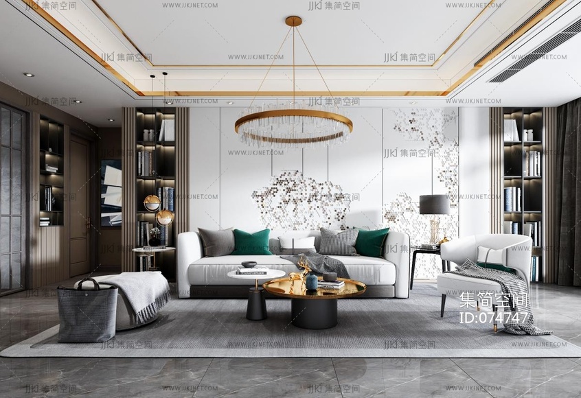 中古风客厅,美式客厅,圆形茶几,装饰画,移动电视,3d模型下载