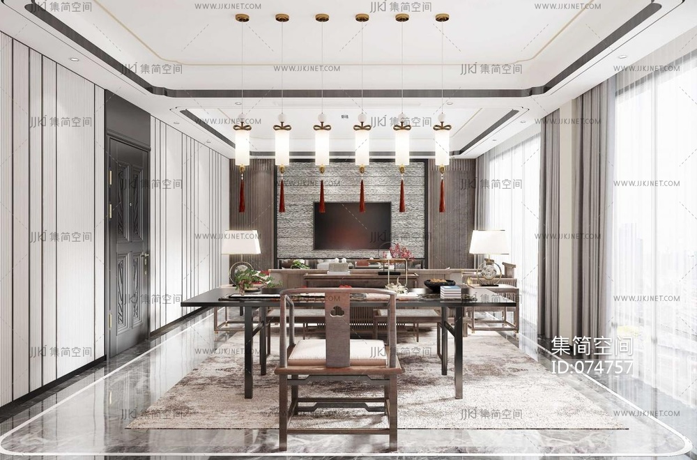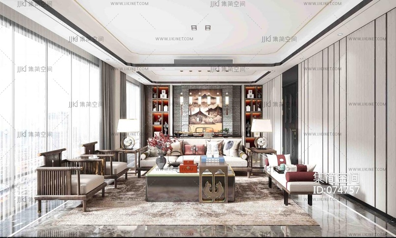 中古风客厅 沙发茶几组合 背景墙3d模型下载