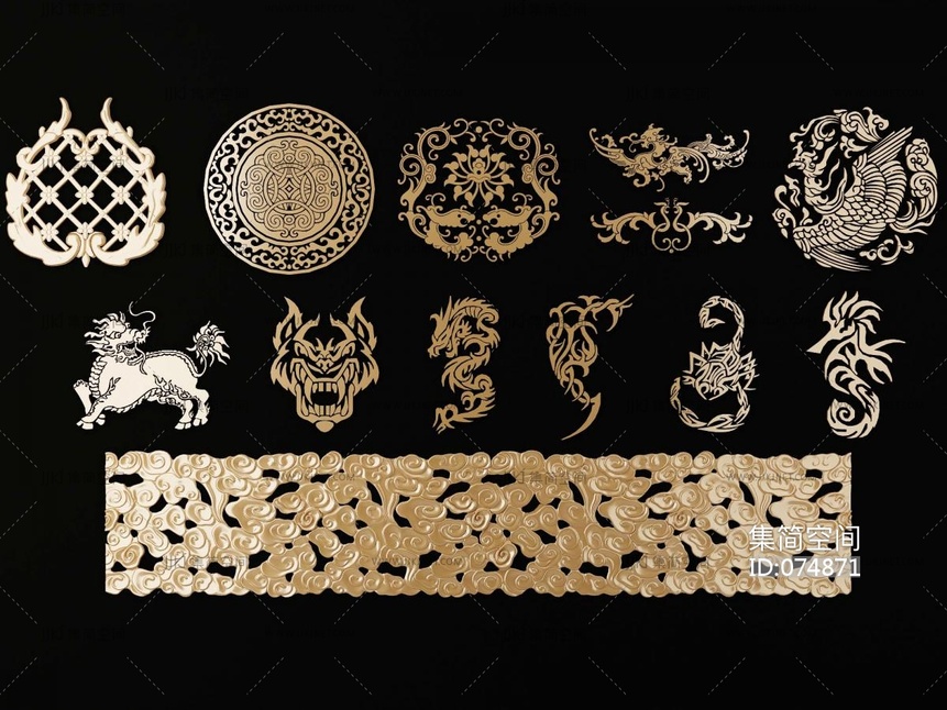 中式龙凤麒麟祥云,云纹,纹路雕花,浮雕木雕,雕刻 3d模型下载 [模型ID:74871]
