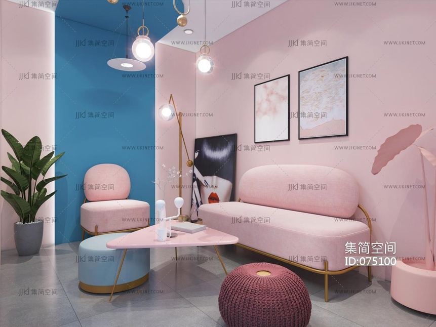 网红北欧现代休息区,沙发茶几椅子,小吊灯 3d模型下载 [模型ID:75100]