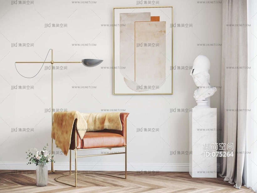 现代 皮革单人沙发 落地灯 装饰画 石膏像休闲单椅,椅子 3d模型下载 [模型ID:75264]