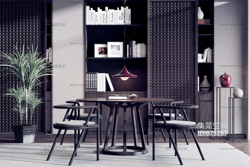 新中式圆形实木餐桌椅,摆台,书柜组合 3d模型下载 [模型ID:75287]