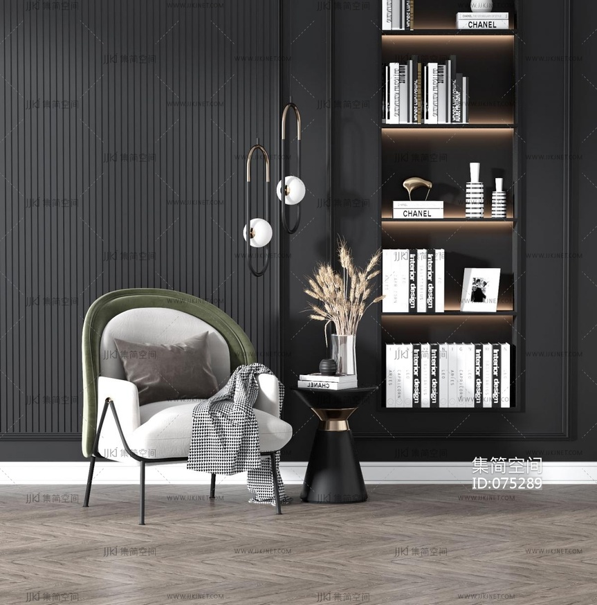 现代轻奢休闲椅,边几,麦穗花瓶 3d模型下载 [模型ID:75289]