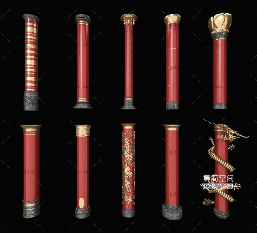 01中式柱子,金色柱头,莲花瓣底座3d模型下载 3d模型下载 [模型ID:75423]