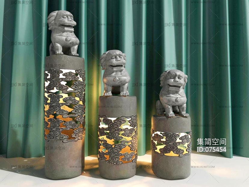 中式景观柱头灯,麒麟,祥云,云纹浮雕 3d模型下载 [模型ID:75454]