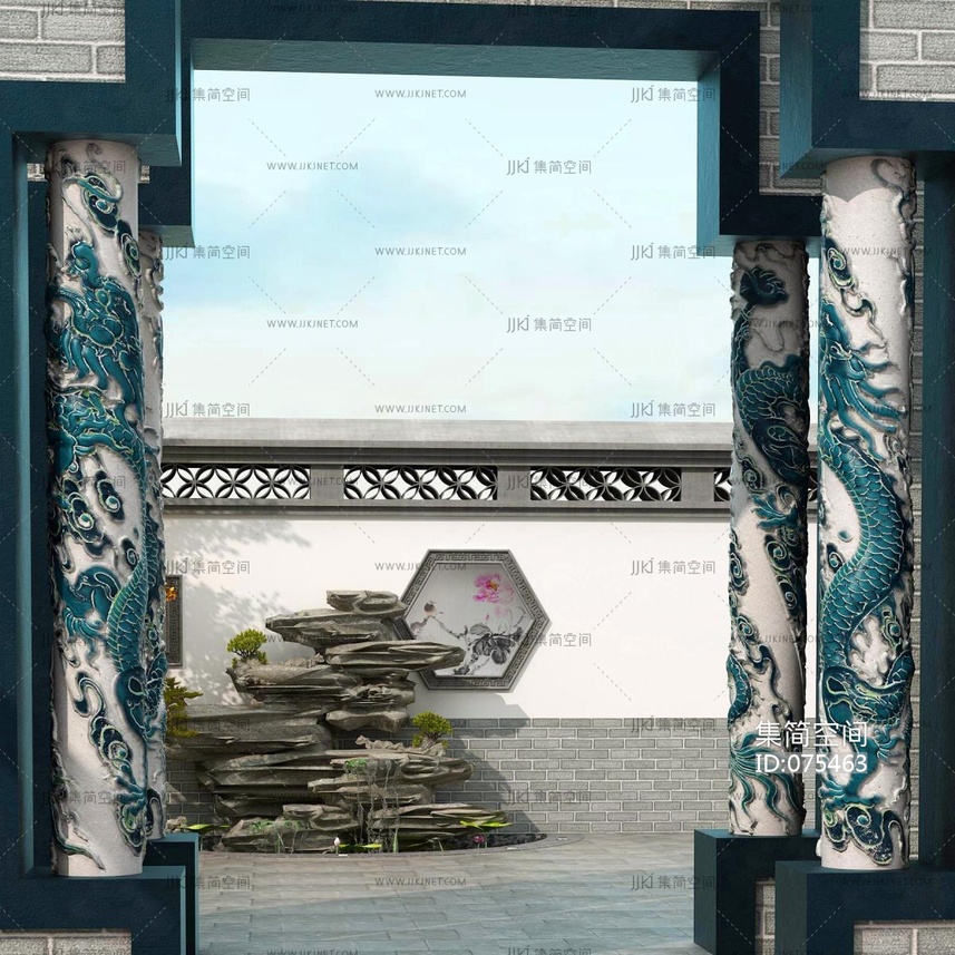 08中式盘龙,浮雕,柱子,庭院,假山, 3d模型下载 [模型ID:75463]