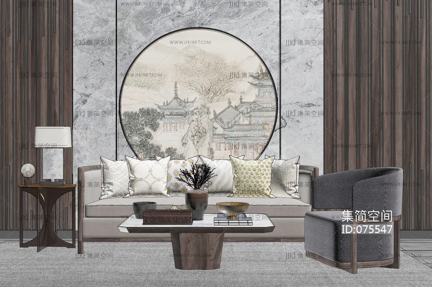 159新中式现代沙发茶几组合,灯几,中式背景墙,单人沙发,陶罐,摆件组合 su草图模型下载 [模型ID:75547]