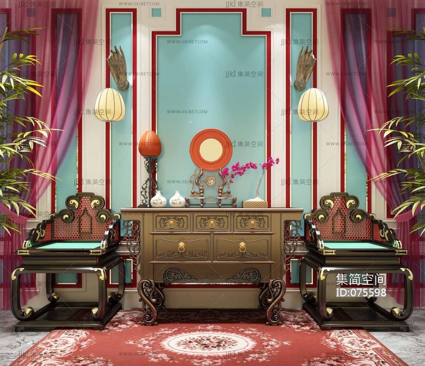 中式古典彩绘玄关墙背景墙,椅子,装饰柜组合 3d模型下载 [模型ID:75598]