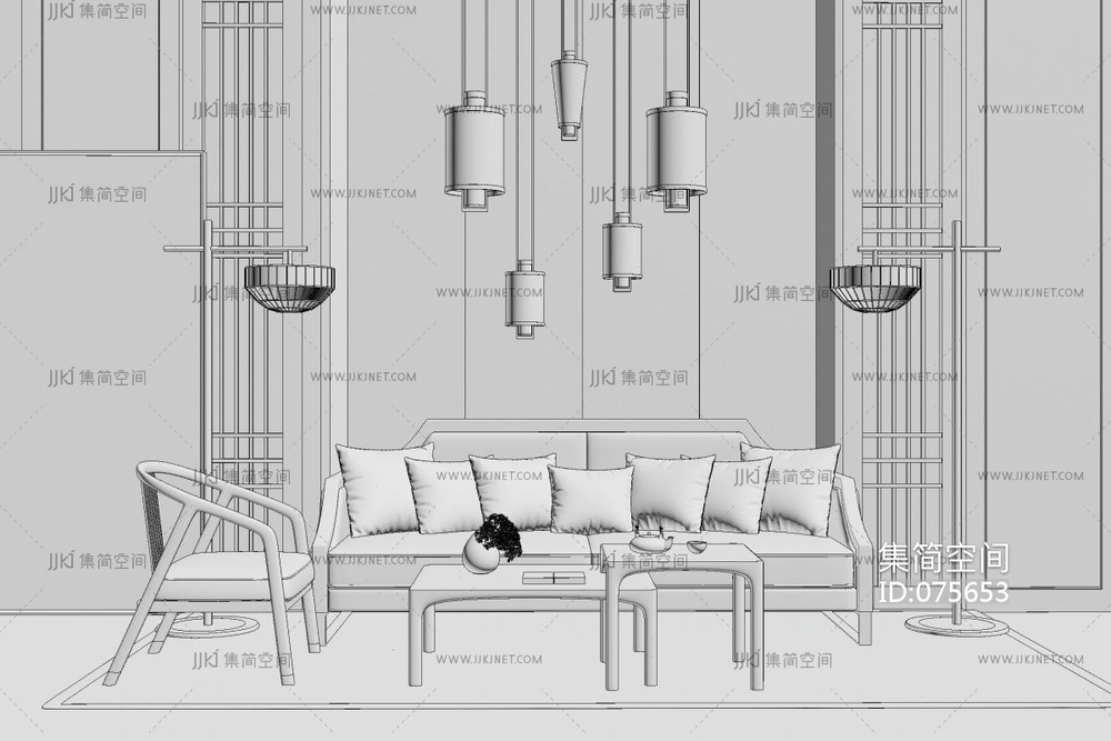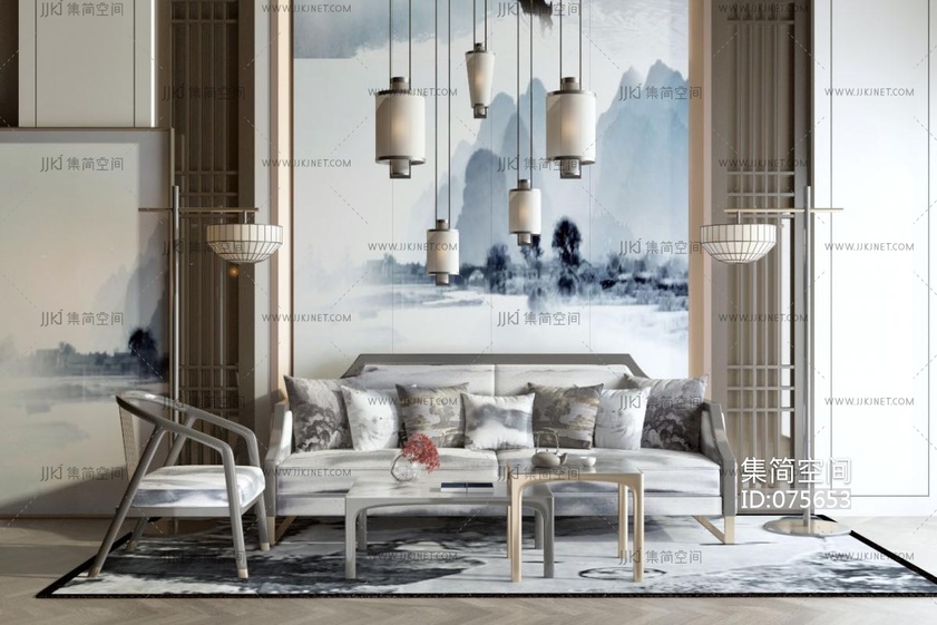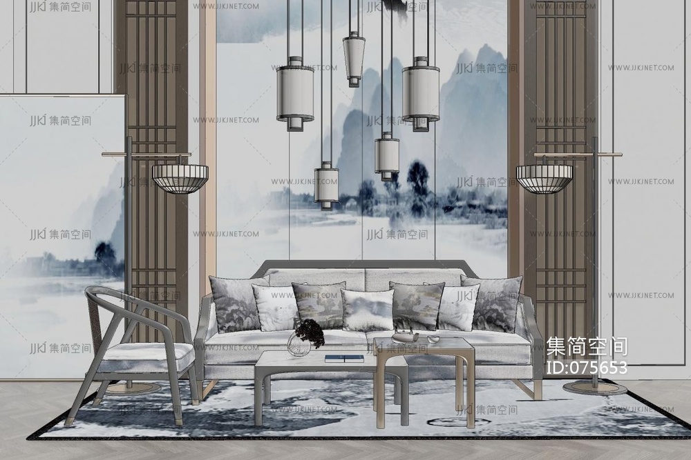 192新中式沙发茶几组合,水墨山水画中式背景墙,格栅,吊灯,单人椅,摆件组合,抱枕靠垫 su草图模型下载 [模型ID:75653]