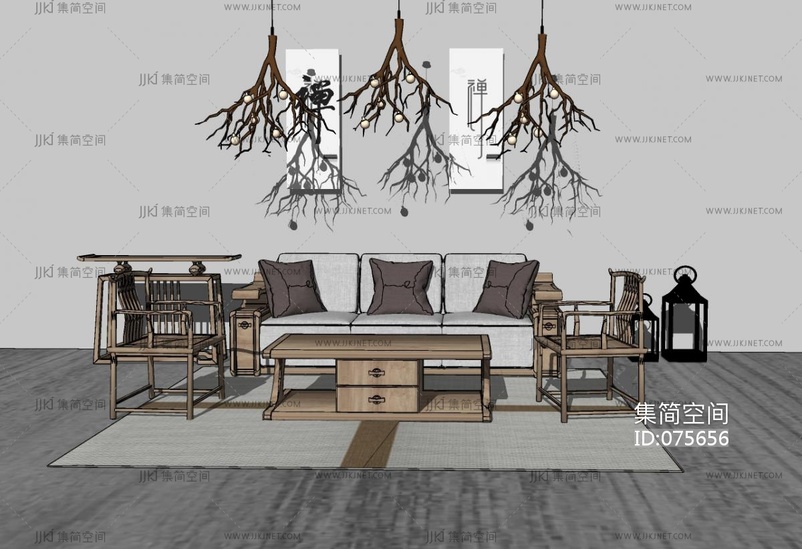 194新中式实木禅意沙发茶几组合 实木单人椅,边几摆件,树枝树杈吊灯 su草图模型下载 [模型ID:75656]