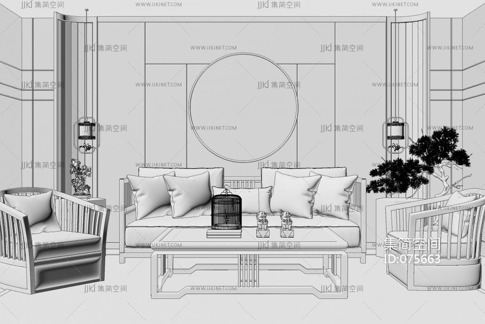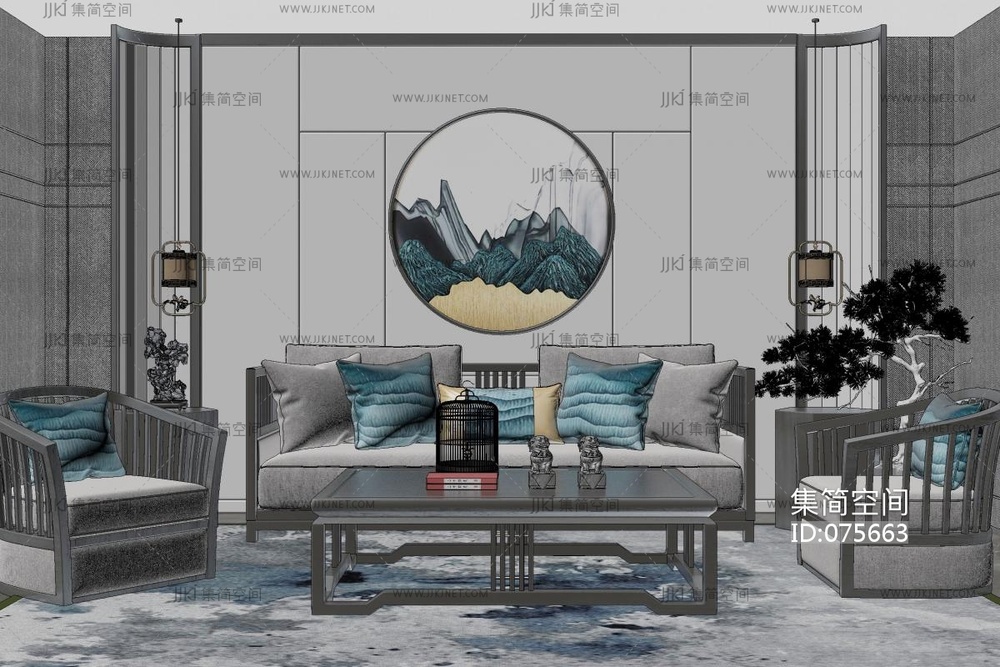 198新中式禅意沙发茶几组合,水墨山水画中式背景墙,格栅,单人椅,盆栽绿植 su草图模型下载 [模型ID:75663]