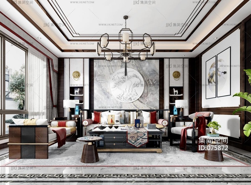 中古风客厅 沙发茶几组合 背景墙3d模型下载