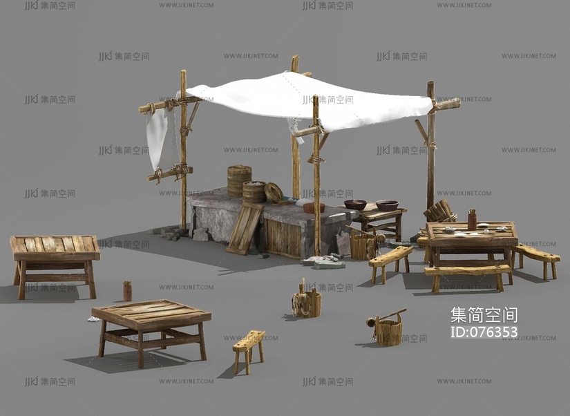 中式古代外摆摊位,,帐篷遮阳伞木头劈柴,柴火,柴火堆, 3d模型下载 [模型ID:76353]