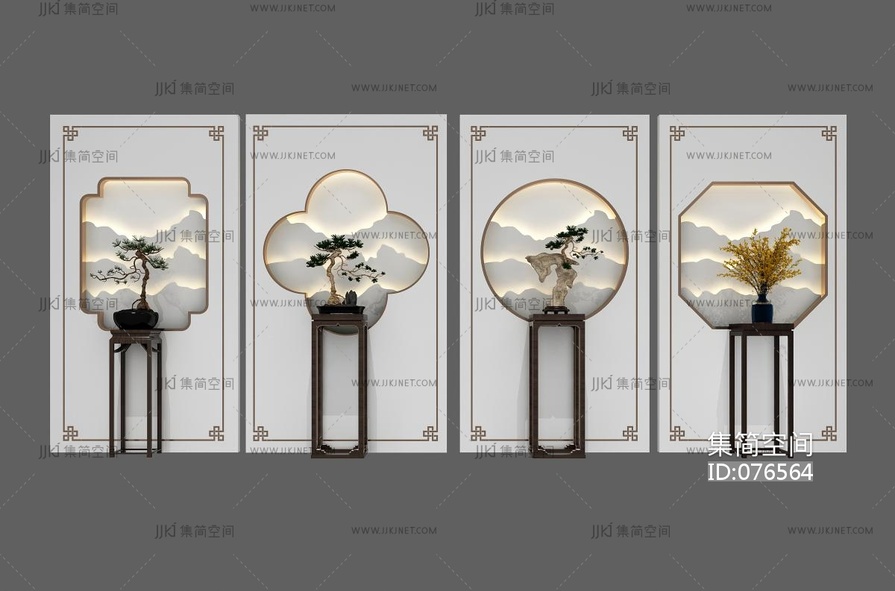 新中式玄关背景墙条几盆景组合 3d模型下载 [模型ID:76564]