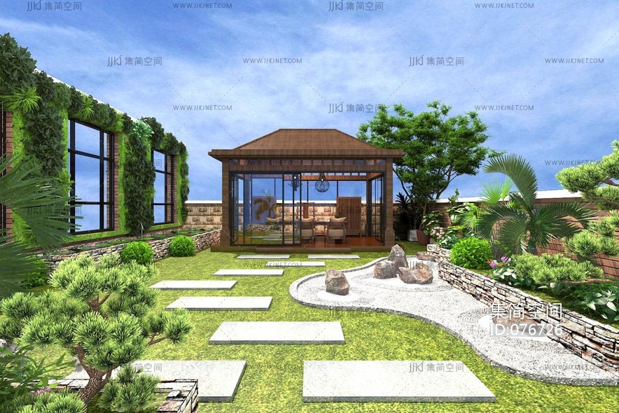 08中式凉亭,庭院,植物,假山,围墙,桌椅 3d模型下载 [模型ID:76726]