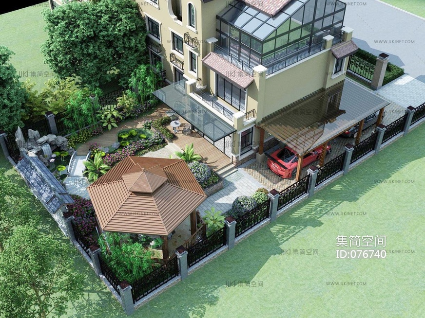 中式欧式别墅景观庭院,凉亭,假山,车库,桌椅,栏杆 3d模型下载 [模型ID:76740]