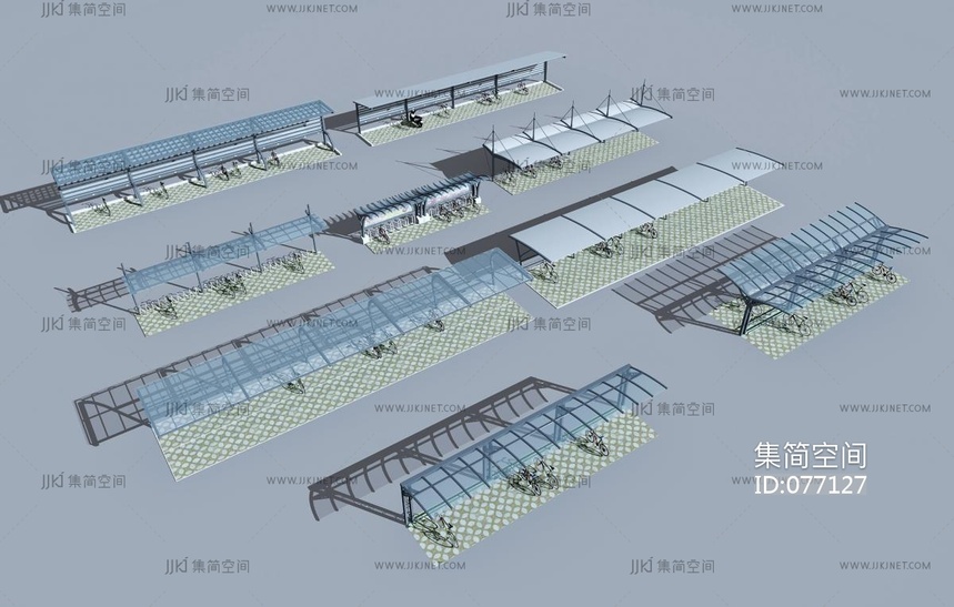 现代钢架玻璃自行车雨棚,遮阳棚 3d模型下载 [模型ID:77127]