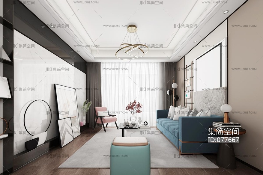 中古风客厅,美式客厅,圆形茶几,装饰画,移动电视,3d模型下载