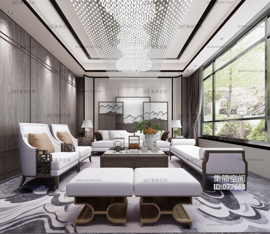中古风客厅 沙发茶几组合 背景墙3d模型下载