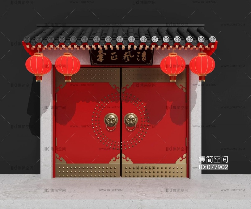 式庭院门入户门门头屋檐3,灯笼大门,抱鼓,d模型3d模型下载