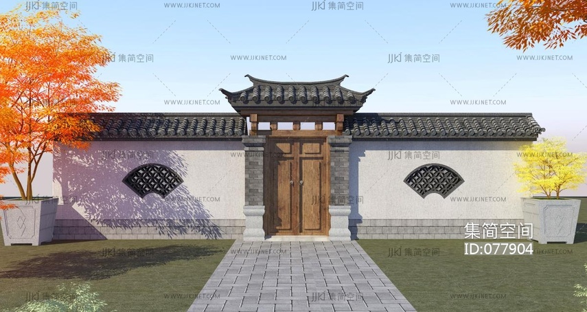 中式大门,门头,围墙院墙,树, 3d模型下载 [模型ID:77904]