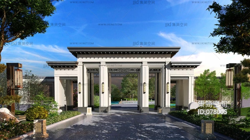 式庭院门入户门门头屋檐3,灯笼大门,抱鼓,d模型3d模型下载