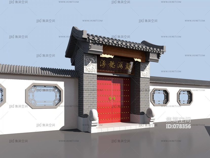 式庭院门入户门门头屋檐3,灯笼大门,抱鼓,d模型3d模型下载