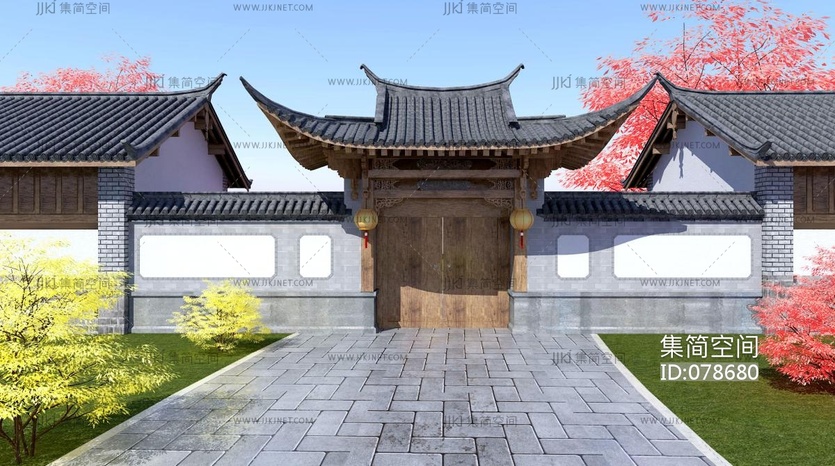 式庭院门入户门门头屋檐3,灯笼大门,抱鼓,d模型3d模型下载