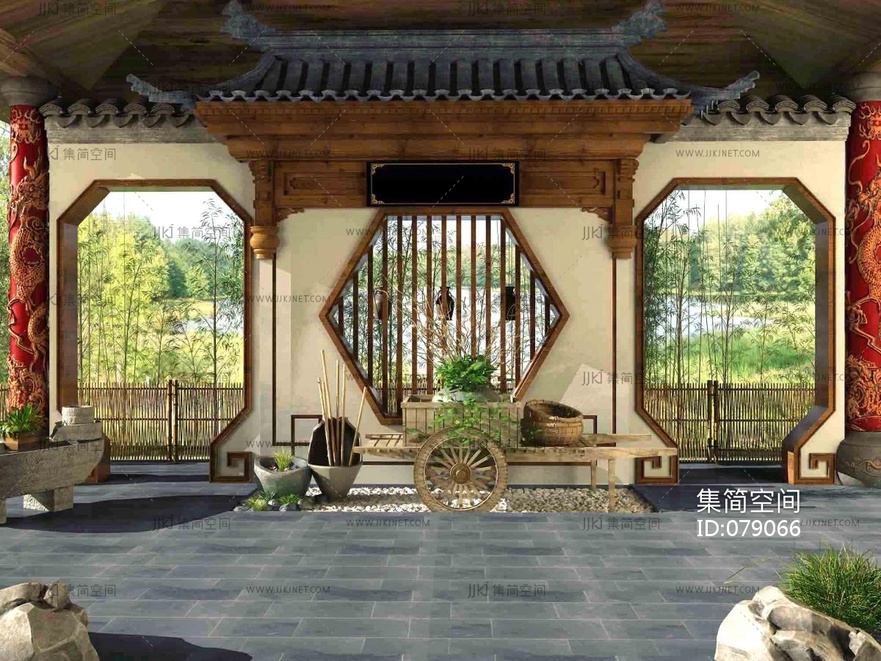 新中式古建筑屋檐木栅栏,农家乐 3d模型下载 [模型ID:79066]