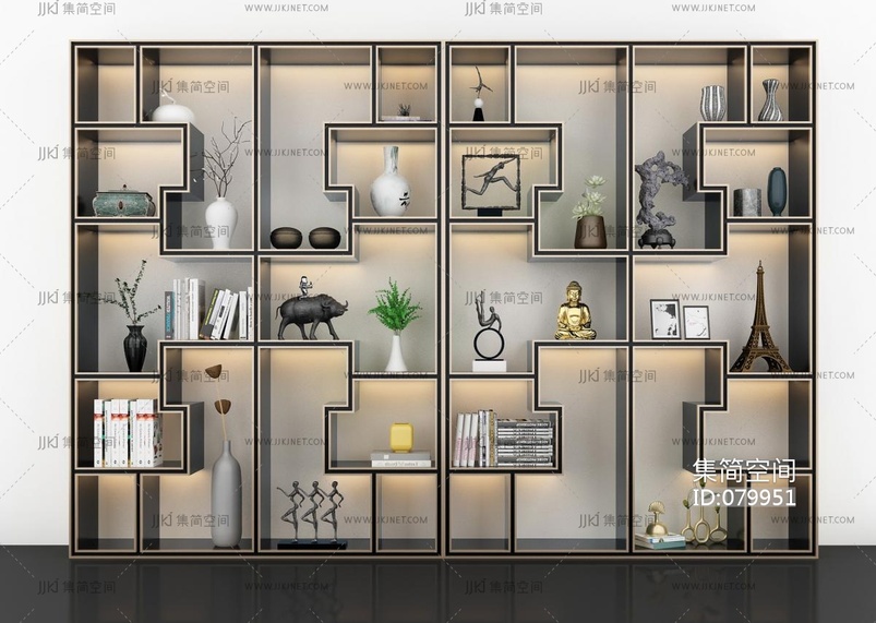 新中式博古架摆台花架佛头竹简3D模型3d模型下载