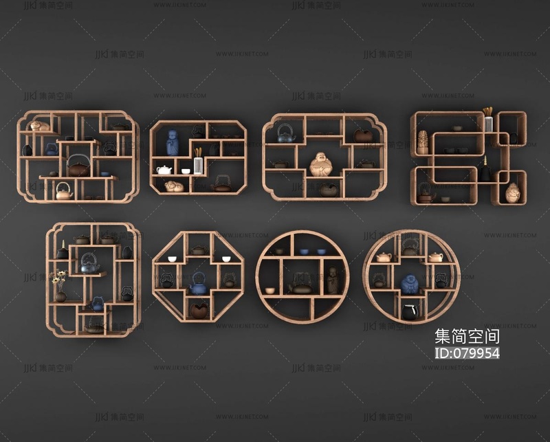 中式古典实木博古架,茶具茶壶多宝阁格 3d模型下载 [模型ID:79954]