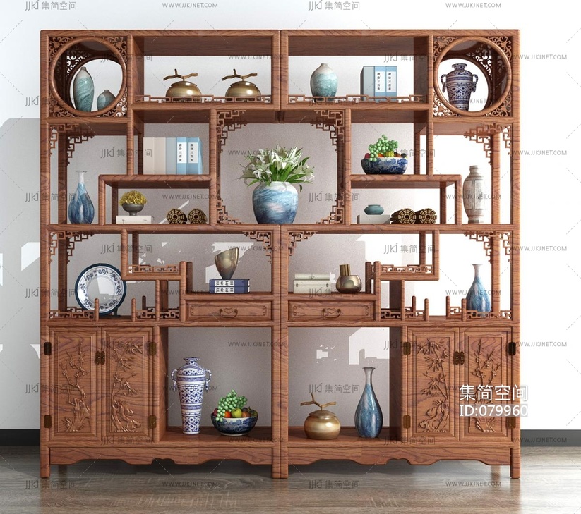 中式古典实木雕花博古架多宝阁格,书架,摆件, 3d模型下载 [模型ID:79960]