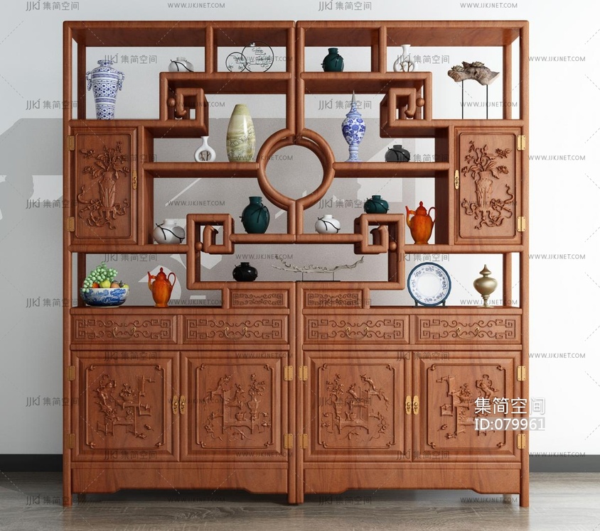 古典实木雕花博古架多宝阁格,书架,摆件,花瓶 3d模型下载 [模型ID:79961]