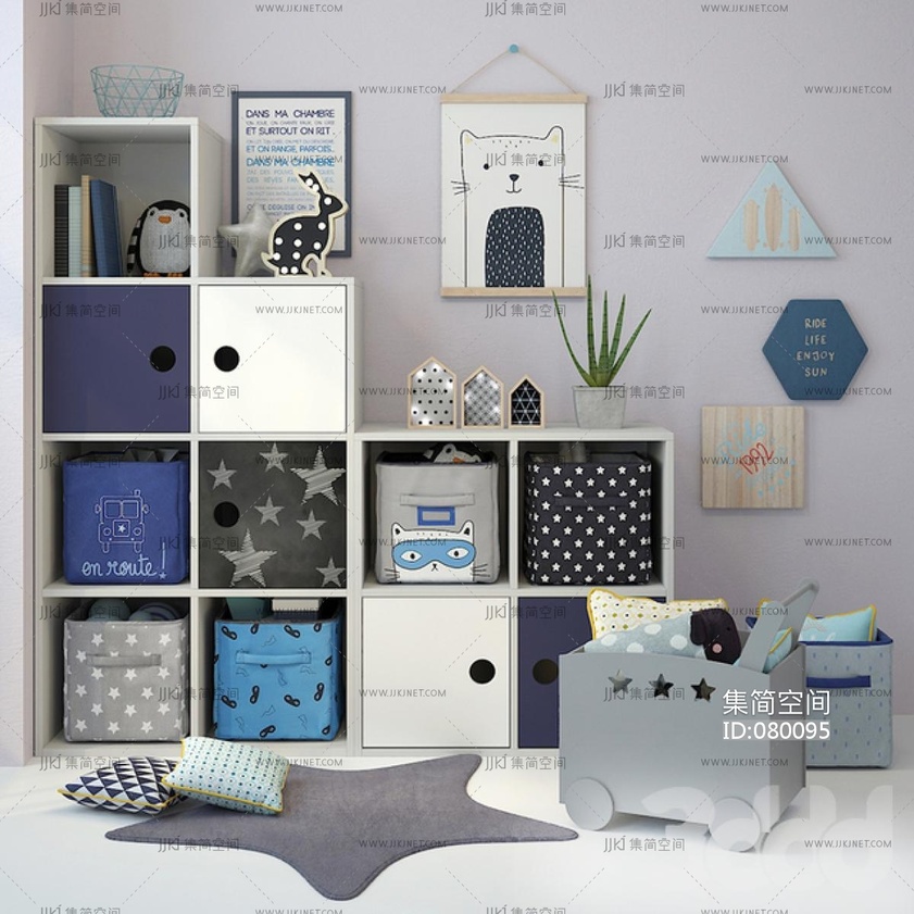 现代儿童房玩具柜储物柜,地毯墙饰挂饰挂件 3d模型下载 [模型ID:80095]