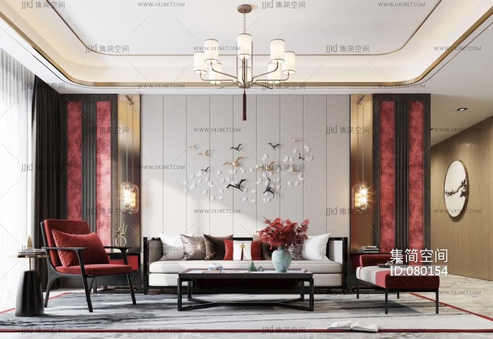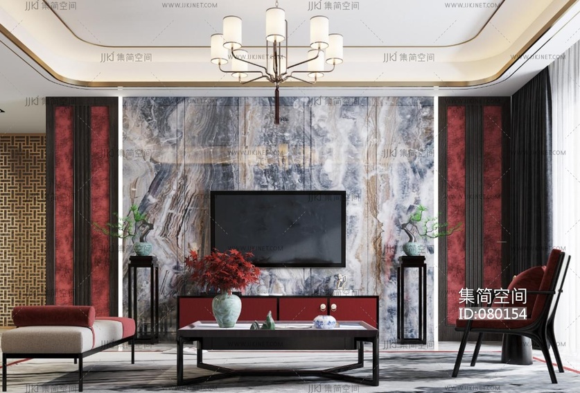 新中式客厅,沙发茶几电视柜,花架摆台椅子 3d模型下载 [模型ID:80154]